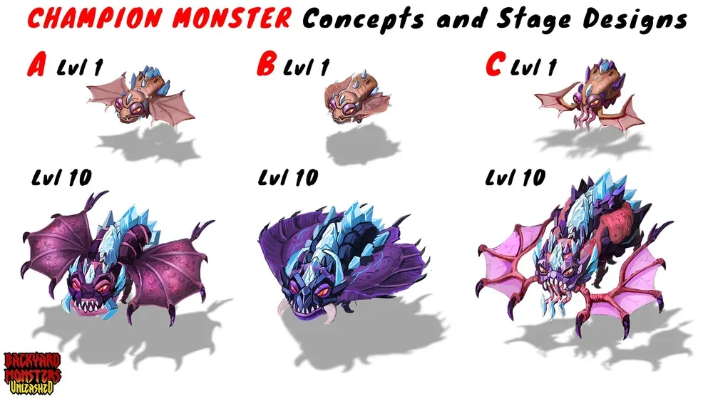 Developed specifically for the mobile version of the game, Backyard Monsters: Unleashed, the Champion Monsters expanded the creature system into tiered evolution paths. Each monster had three variant species (A, B, and C), and each species evolved through ten levels, transforming visually from small hatchlings into large, battle-ready apex forms.