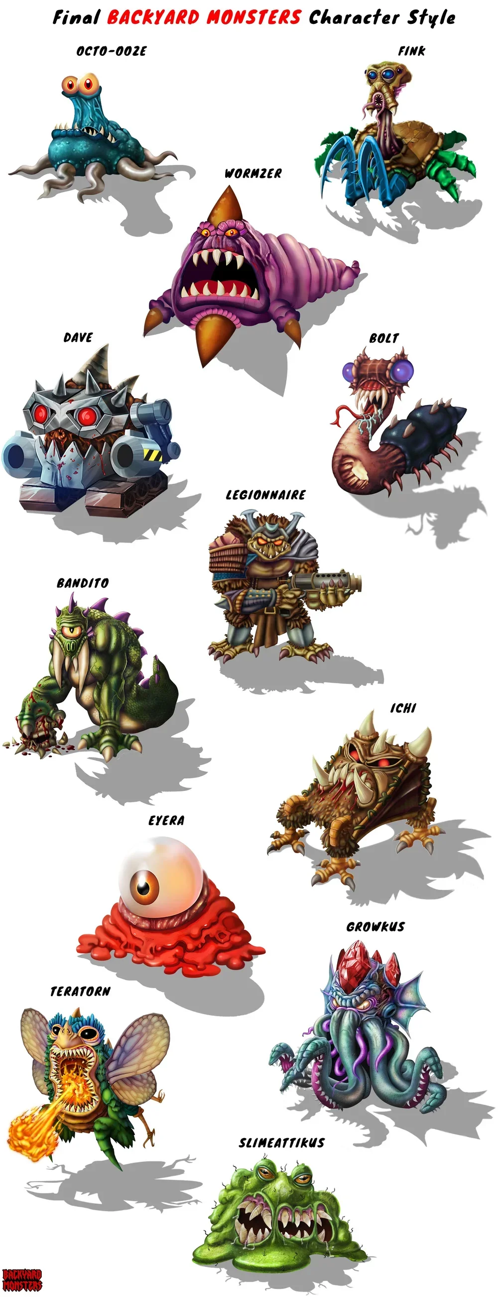 Champion Monsters for Backyard Monsters: Unleashed: tiered evolution designs visualizing growth, mutation, and escalating power.